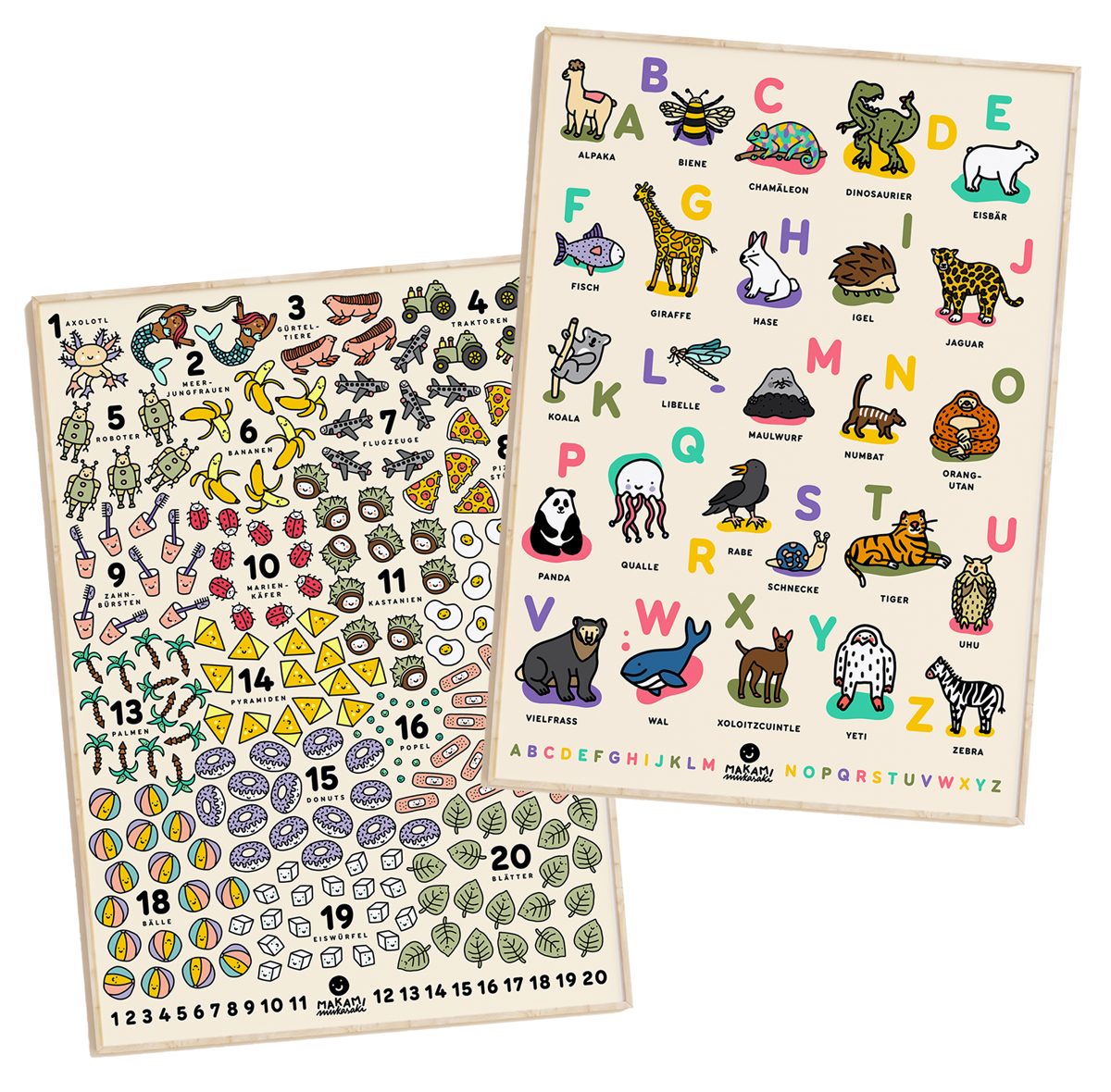 From name to visual identity: creation of the brand . I created Makami Mukasaki, an educational brand built around playful learning characters. I designed the name, logo and visual identity and illustrated a large variety of distinctive figures within the brand.